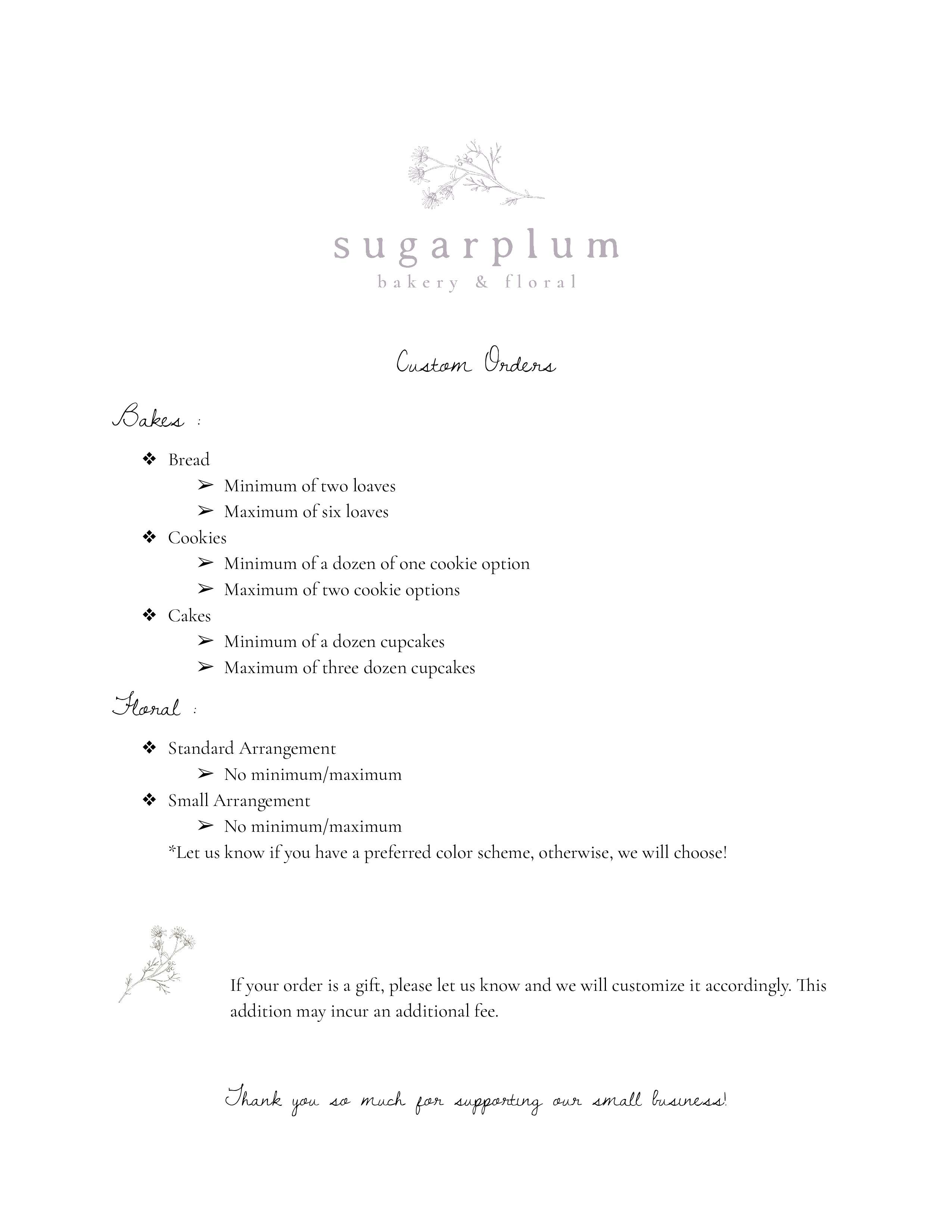 Please pre-order all of your items for the week here on our website to ensure the reservation of all your favorites! As we are a micro-bakery, we are only able to make a certain number of bakes/arrangements each week. Once sold-out, you'll have to wait for the next week we are open! Don't forget–all orders must be placed before Wednesday at 11:59 PM to allow us processing time!